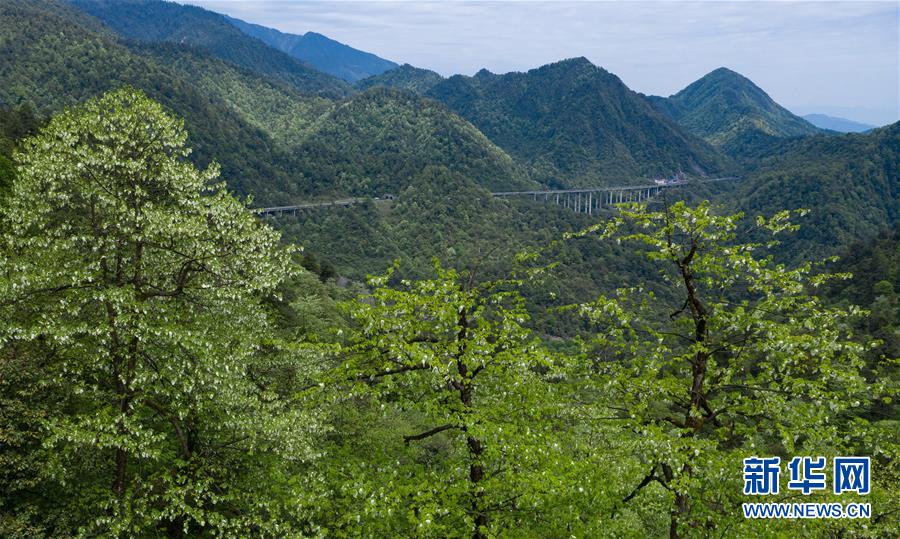 位于四川省荥经县的龙苍沟国家森林公园里,鸽子花盛开(5月4日摄,无人机照片)。目前,位于四川省大相岭山脉东麓北坡的龙苍沟国家森林公园里,约8万亩鸽子花盛开,犹如鸽群展翅欲飞。鸽子花即珙桐花,珙桐是珍稀植物,有着植物“大熊猫”“活化石”之称,是国家一级保护植物,也是著名的观赏植物。2008年,华中农业大学、湖北民族学院和四川省萦经县林业部门联合对龙苍沟森林公园的珙桐进行了种群生态学调查,发现珙桐在这里共分布约8万亩,集中成片分布近4万亩。珙桐面积之大、株数之多、密度之高,十分罕见。新华社记者 江宏景 摄