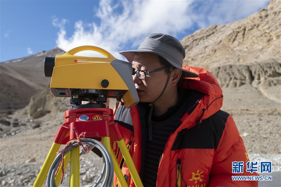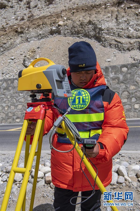 国测一大队队员金良在操作水准仪(4月18日摄)。水准测量是一种利用提供水平视线的仪器(如水准仪、水准标尺),测定地面不同点之间的高差,并以此推算高度的一种方法,是经典大地测量的重要技术之一。在目前正在进行的2020珠峰高程测量中,部分国测一大队队员承担了水准测量的任务。新华社记者晋美多吉摄