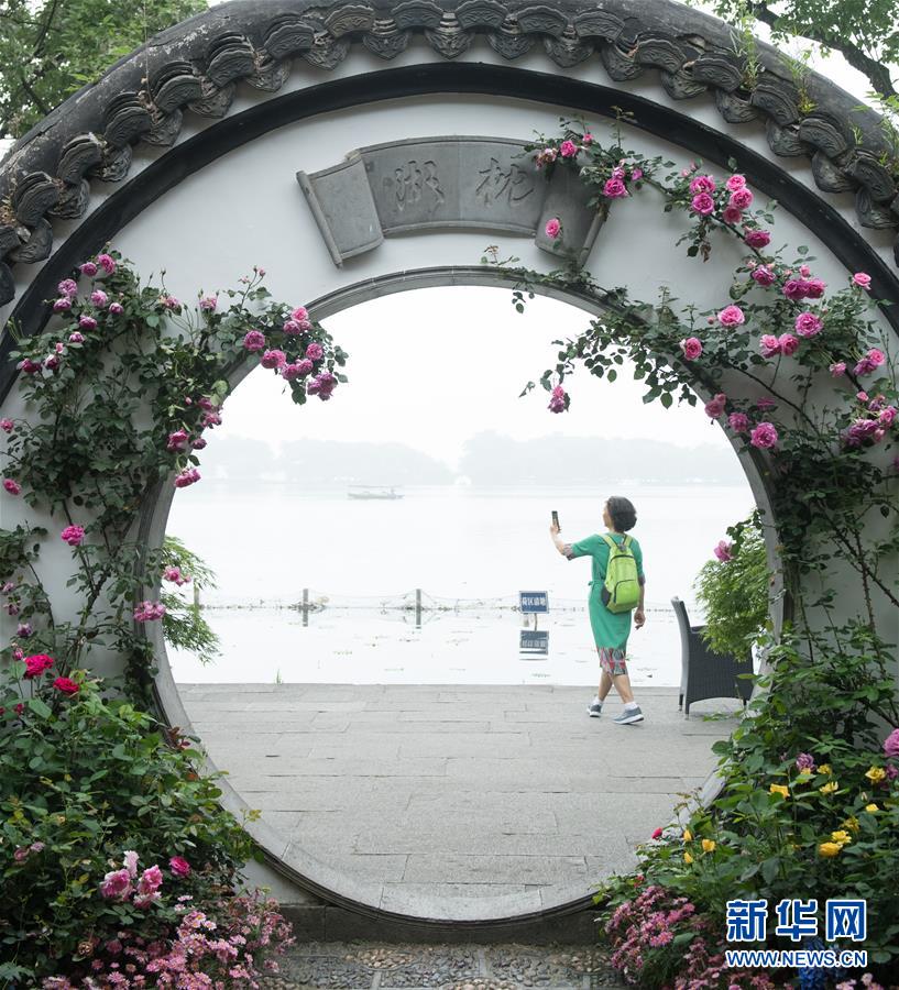 5月5日,游客在西湖畔的郭庄观看月季花展。“五一”期间,第八届杭州西湖月季花精品展在杭州西子湖畔举行,展出国内外700余个月季品种。新华社记者翁忻旸摄