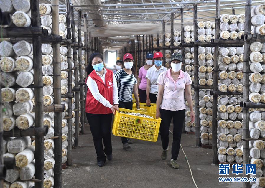 唐莉(左一)在平乐县张家镇食用菌生产基地帮工人搬运袖珍菇(5月4日摄)。新华社记者周华摄