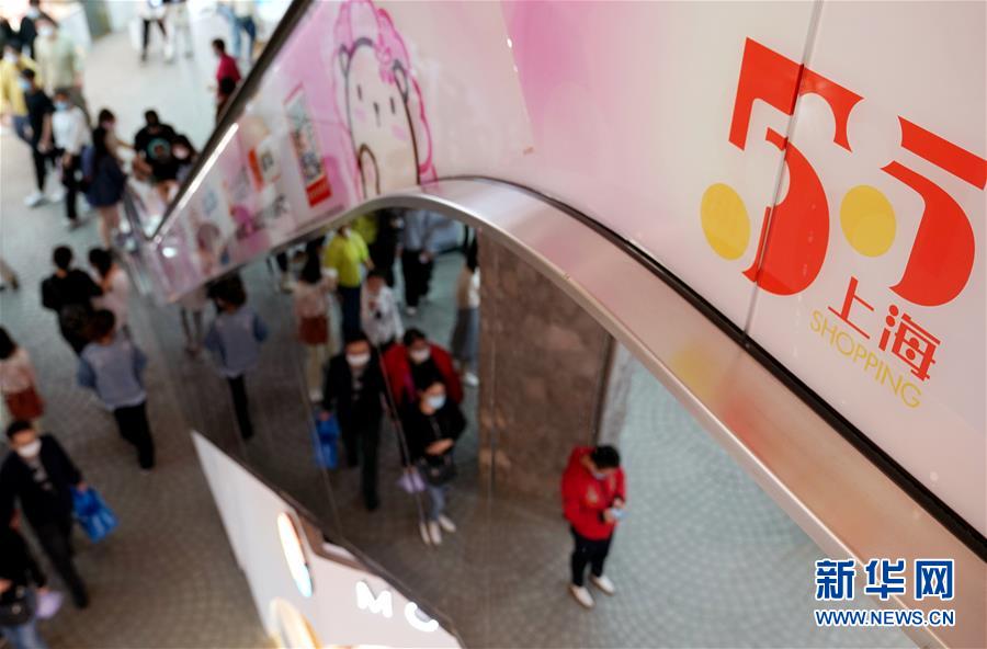 上海一家商场布置的“五五购物节”标识(5月5日摄)。5月4日晚,上海首次启动大规模商业促销活动“五五购物节”,多家在线新经济企业参与,通过线上流量优势反哺线下卖场,实现电商与实体零售融合互动,激活消费潜力、驱动消费复苏。据“上海发布”的消息,截至5日14时12分,“五五购物节”上海地区消费支付总额已超100亿元。新华社记者刘颖摄
