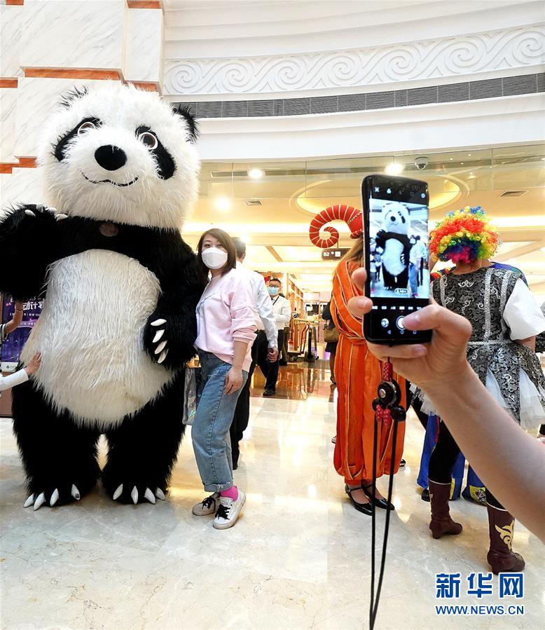 5月5日,顾客在上海环球港商场与大熊猫人偶合影。5月4日晚,上海首次启动大规模商业促销活动“五五购物节”,多家在线新经济企业参与,通过线上流量优势反哺线下卖场,实现电商与实体零售融合互动,激活消费潜力、驱动消费复苏。据“上海发布”的消息,截至5日14时12分,“五五购物节”上海地区消费支付总额已超100亿元。新华社记者陈飞摄