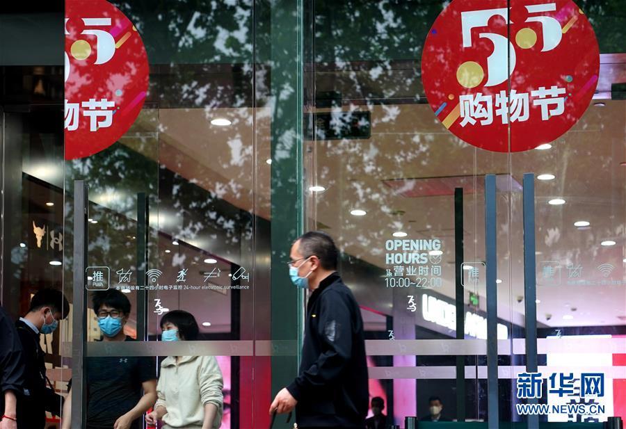 上海淮海路一家商场的“五五购物节”标识(5月5日摄)。5月4日晚,上海首次启动大规模商业促销活动“五五购物节”,多家在线新经济企业参与,通过线上流量优势反哺线下卖场,实现电商与实体零售融合互动,激活消费潜力、驱动消费复苏。据“上海发布”的消息,截至5日14时12分,“五五购物节”上海地区消费支付总额已超100亿元。新华社记者刘颖摄
