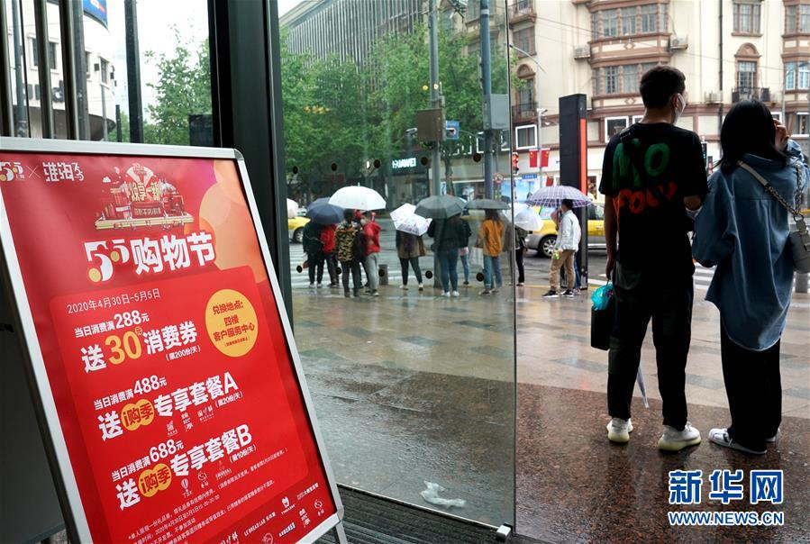上海淮海路一家商场布置的“五五购物节”活动信息(5月5日摄)。5月4日晚,上海首次启动大规模商业促销活动“五五购物节”,多家在线新经济企业参与,通过线上流量优势反哺线下卖场,实现电商与实体零售融合互动,激活消费潜力、驱动消费复苏。据“上海发布”的消息,截至5日14时12分,“五五购物节”上海地区消费支付总额已超100亿元。新华社记者刘颖摄