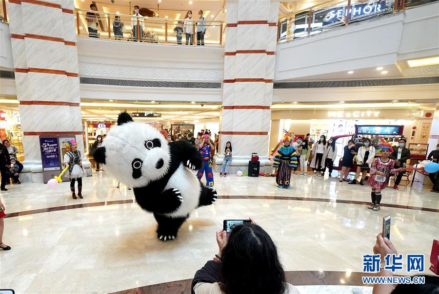 5月5日,大熊猫人偶在上海环球港商场为“五五购物节”营造气氛。5月4日晚,上海首次启动大规模商业促销活动“五五购物节”,多家在线新经济企业参与,通过线上流量优势反哺线下卖场,实现电商与实体零售融合互动,激活消费潜力、驱动消费复苏。据“上海发布”的消息,截至5日14时12分,“五五购物节”上海地区消费支付总额已超100亿元。新华社记者陈飞摄