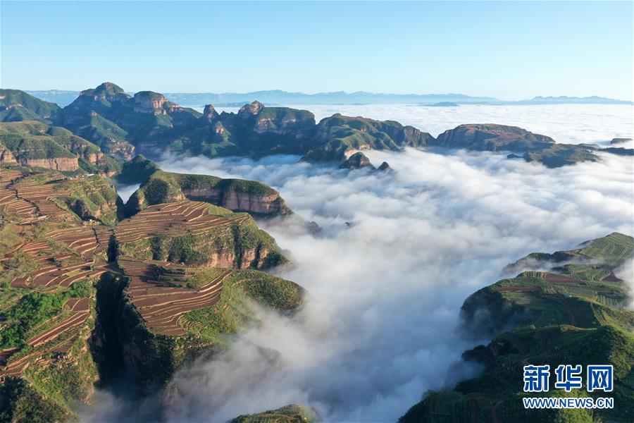 这是5月5日在河北省沙河市刘石岗乡渐凹村拍摄的云海景观(无人机照片)。5月5日,雨后的河北省沙河市刘石岗乡渐凹村云雾飘渺,村庄、山峦、梯田在云海中若隐若现,构成一幅美丽画卷。新华社记者牟宇摄