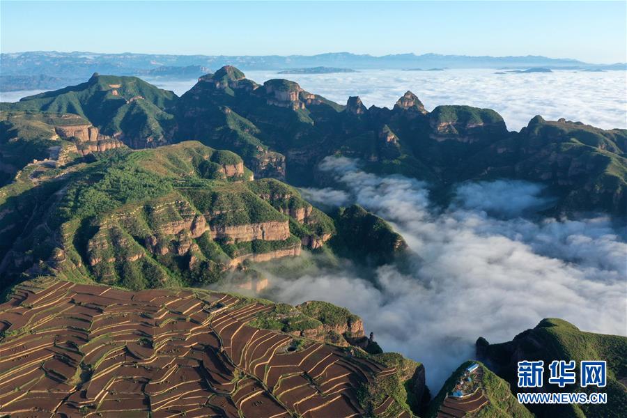 这是5月5日在河北省沙河市刘石岗乡渐凹村拍摄的云海景观(无人机照片)。5月5日,雨后的河北省沙河市刘石岗乡渐凹村云雾飘渺,村庄、山峦、梯田在云海中若隐若现,构成一幅美丽画卷。新华社记者牟宇摄