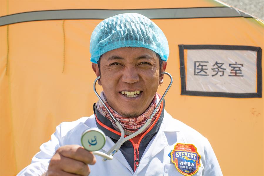 高山医生阿旺罗布在珠峰大本营(5月8日摄)。5月8日是世界微笑日。在海拔5200米的珠峰大本营,参与2020珠峰高程测量的各方人员,微笑期待本次测量活动的圆满成功。