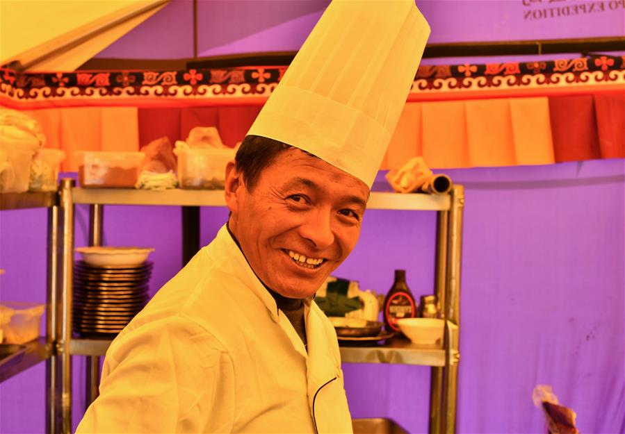 高山厨师赤列在珠峰大本营(5月8日摄)。5月8日是世界微笑日。在海拔5200米的珠峰大本营,参与2020珠峰高程测量的各方人员,微笑期待本次测量活动的圆满成功。