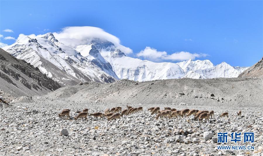 一群岩羊在珠峰大本营附近觅食(5月8日摄)。当日,一群岩羊在珠峰大本营周围觅食,黄嘴山鸦飞到岩羊身上停留,构成一幅幅生动有趣的雪域图画。新华社记者晋美多吉摄