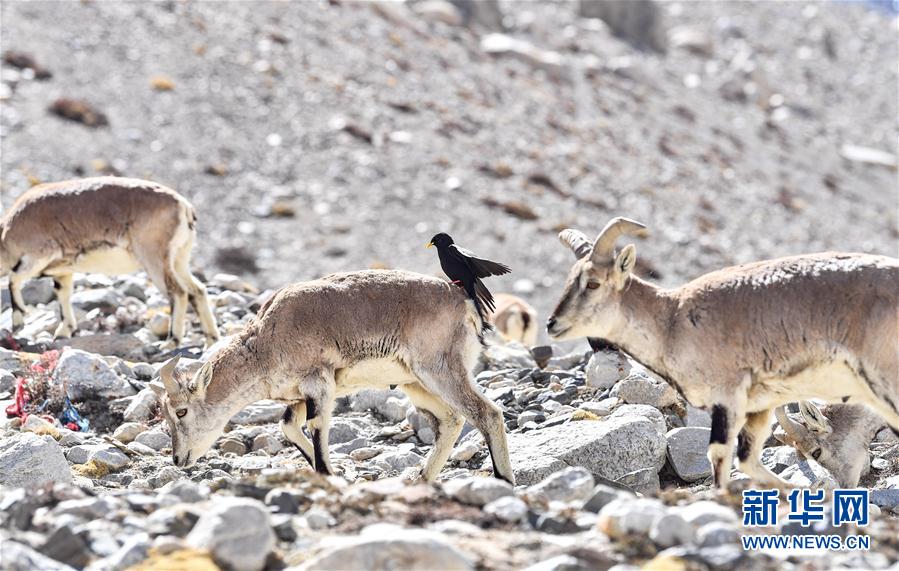一只黄嘴山鸦停留在岩羊身上(5月8日摄)。当日,一群岩羊在珠峰大本营周围觅食,黄嘴山鸦飞到岩羊身上停留,构成一幅幅生动有趣的雪域图画。新华社记者晋美多吉摄