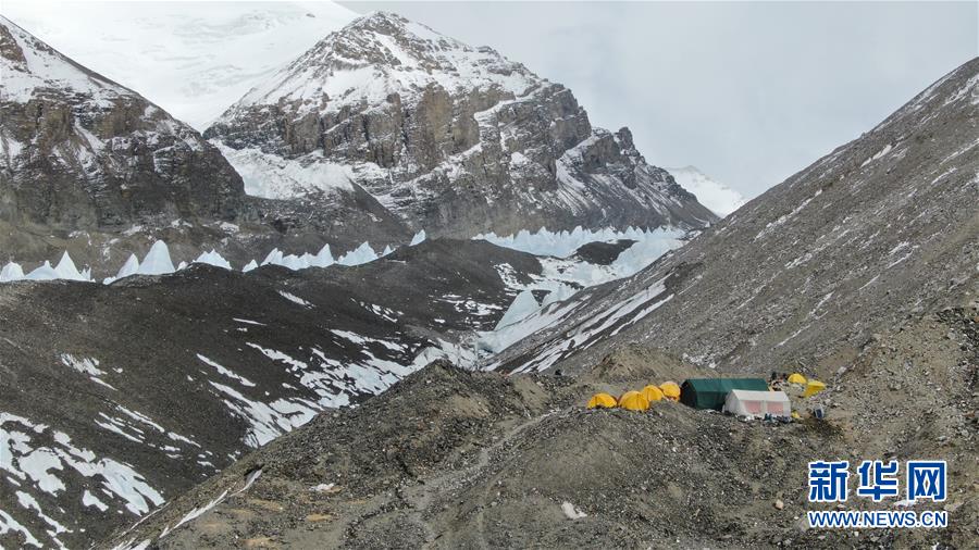 这是海拔5800米的珠峰过渡营地(5月8日摄,无人机照片)。珠峰过渡营地海拔5800米,是连接前进营地和珠峰大本营的重要一站。登山爱好者从大本营徒步大约四个小时就能抵达过渡营地。此段路程乱石林立,同时也能欣赏壮美的冰川。新华社记者孙非摄