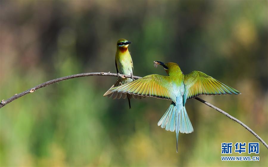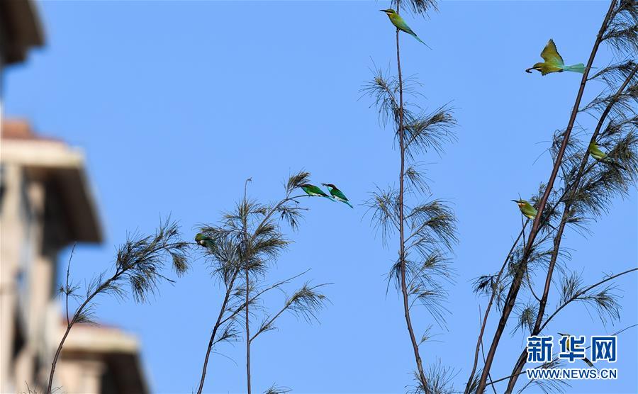 在海口五源河下游蜂虎保护小区,栗喉蜂虎在嬉戏(5月7日摄)。新华社记者杨冠宇摄