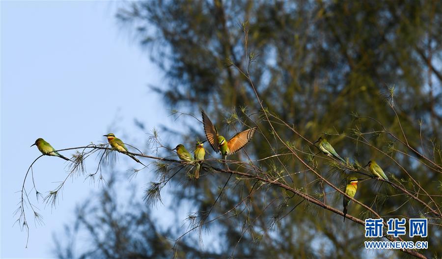 5月8日,在海口五源河下游蜂虎保护小区,栗喉蜂虎和蓝喉蜂虎在树枝上休息。新华社记者杨冠宇摄