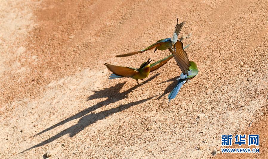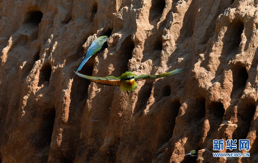 近日,百余只栗喉蜂虎和少量蓝喉蜂虎来到海南省海口市西海岸多个地点栖息繁衍,为椰城增添一抹亮色。据了解,蜂虎每年春夏都会回到固定地点繁殖,由于习性特殊,蜂虎需要在新形成的沙质土坡上做窝。为此,海口市相关部门每年在蜂虎到来之前,会在蜂虎栖息地整坡清树,为蜂虎营造良好的栖息环境。