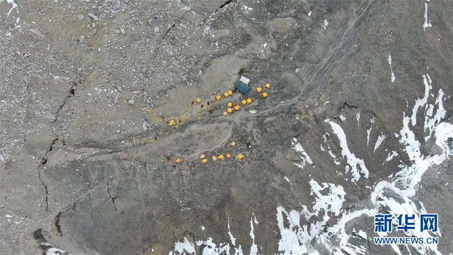这是海拔5800米的过渡营地(5月8日摄,无人机照片)。珠峰过渡营地海拔5800米,是连接前进营地和珠峰大本营的重要一站。登山爱好者从大本营徒步大约四个小时就能抵达过渡营地。此段路程乱石林立,同时也能欣赏壮美的冰川。新华社记者孙非摄