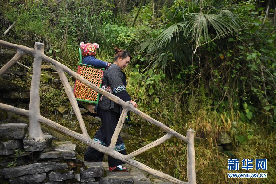 吴美金背着孙子走在十八洞村中,准备前往村里的苗绣合作社(4月24日摄)。1967年出生的吴美金,1992年嫁入飞虫村(现十八洞村飞虫寨)时,只有烂泥路的飞虫村不仅田土少,挣钱活路也少,生活十分困难。2014年,吴美金加入了十八洞村苗绣特产农民专业合作社,从小就会的苗绣传统手艺如今成了家庭增收的法宝,不仅在家门口就把钱挣了,同时还能照顾年幼的孙子孙女。“现在的日子,比年轻的时候好多了。”吴美金说。新华社记者薛宇舸摄