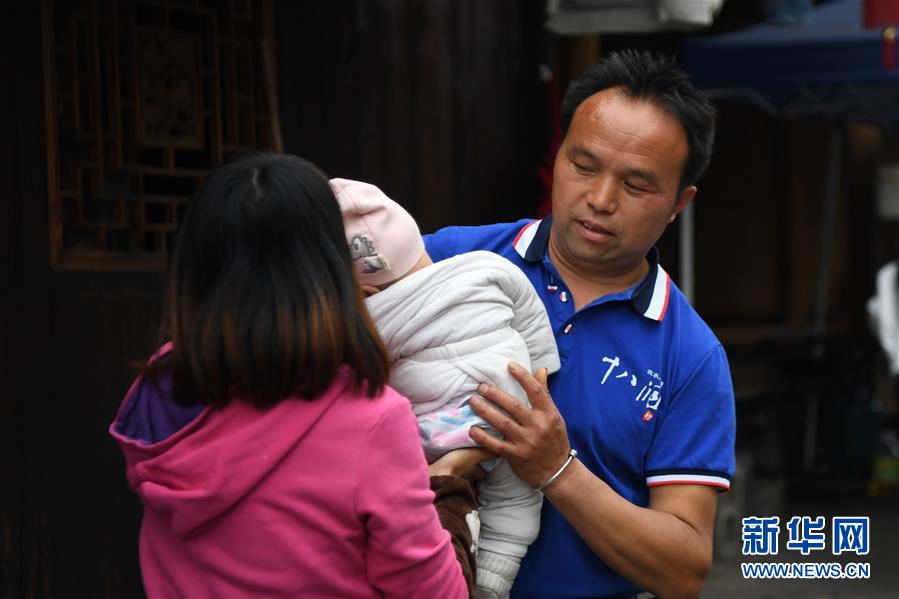 施六金(右)从妻子手中接过儿子施泽恩(4月25日摄)。1973年出生于十八洞村的施六金,由于父亲患病很早就放弃学业和母亲扛起了家庭的重担。为了生活,他还曾远去东南亚打工。2015年,看到家乡的变化,施六金回到村里开起了农家乐,年度家庭人均纯收入也从2014年的1715元增长到了2019年的35696元。2018年,施六金与心爱的人组建了家庭。今年初,施六金与爱人迎来了一个大胖小子。“做人做事要懂得回报和感恩。”施六金给刚出生的儿子取名施泽恩。新华社记者薛宇舸摄