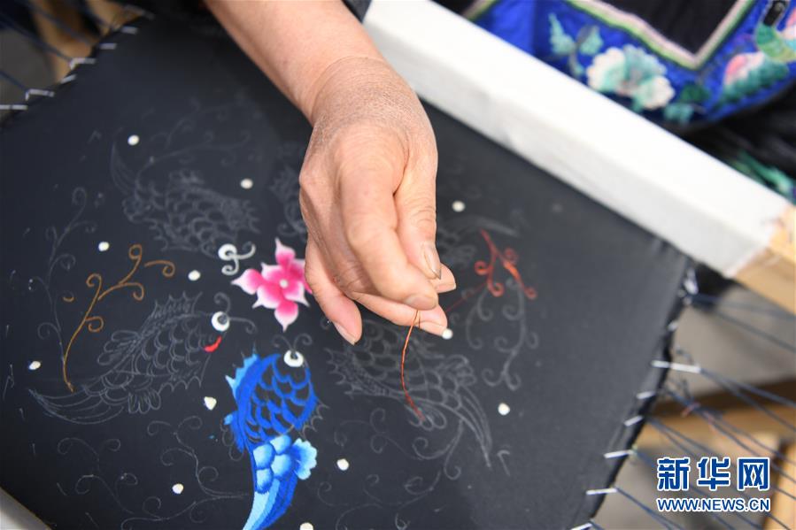 吴美金在十八洞村苗绣特产农民专业合作社绣苗绣(4月24日摄)。1967年出生的吴美金,1992年嫁入飞虫村(现十八洞村飞虫寨)时,只有烂泥路的飞虫村不仅田土少,挣钱活路也少,生活十分困难。2014年,吴美金加入了十八洞村苗绣特产农民专业合作社,从小就会的苗绣传统手艺如今成了家庭增收的法宝,不仅在家门口就把钱挣了,同时还能照顾年幼的孙子孙女。“现在的日子,比年轻的时候好多了。”吴美金说。新华社记者薛宇舸摄