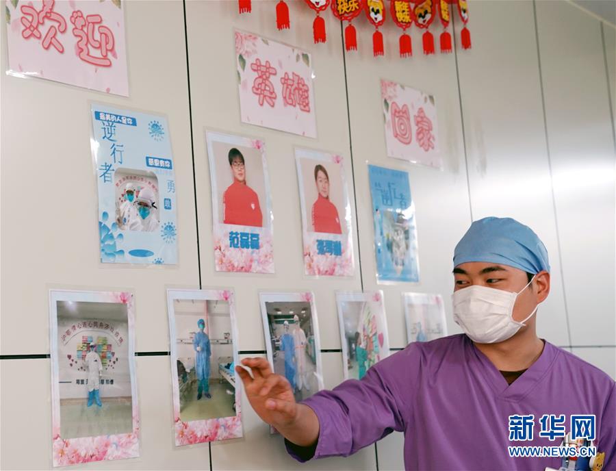 5月10日,上海市普陀区中心医院急诊重症监护室的护士范磊磊站在同事们制作的“荣誉榜”前。这是科室同事为了欢迎他和另一位援鄂护士平安归来而准备的“惊喜礼物”。新华社记者刘颖摄