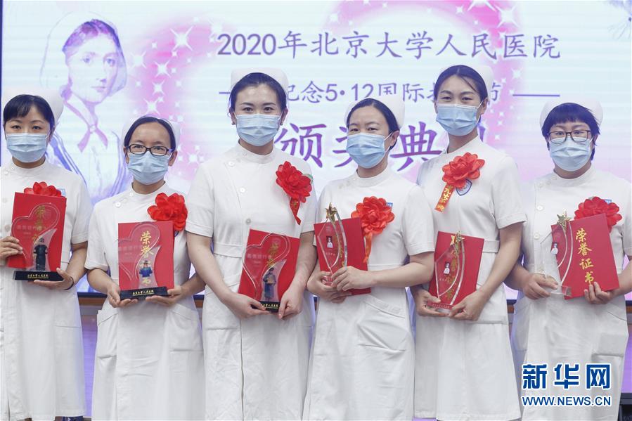 5月11日,获奖护士在护士节活动上合影。在国际护士节到来之际,北京大学人民医院11日举办庆祝护士节暨优秀集体和个人表彰活动,并邀请援鄂医疗队护士代表分享战“疫”故事。我国今年护士节的主题为“致敬护士队伍,携手战胜疫情”。新华社记者张玉薇摄