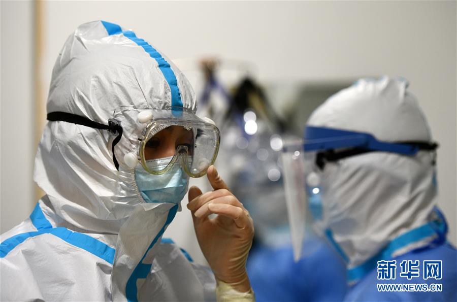 5月11日,在空港医院的隔离病房,护士整理护目镜准备进入“红区”。新华社记者李然摄