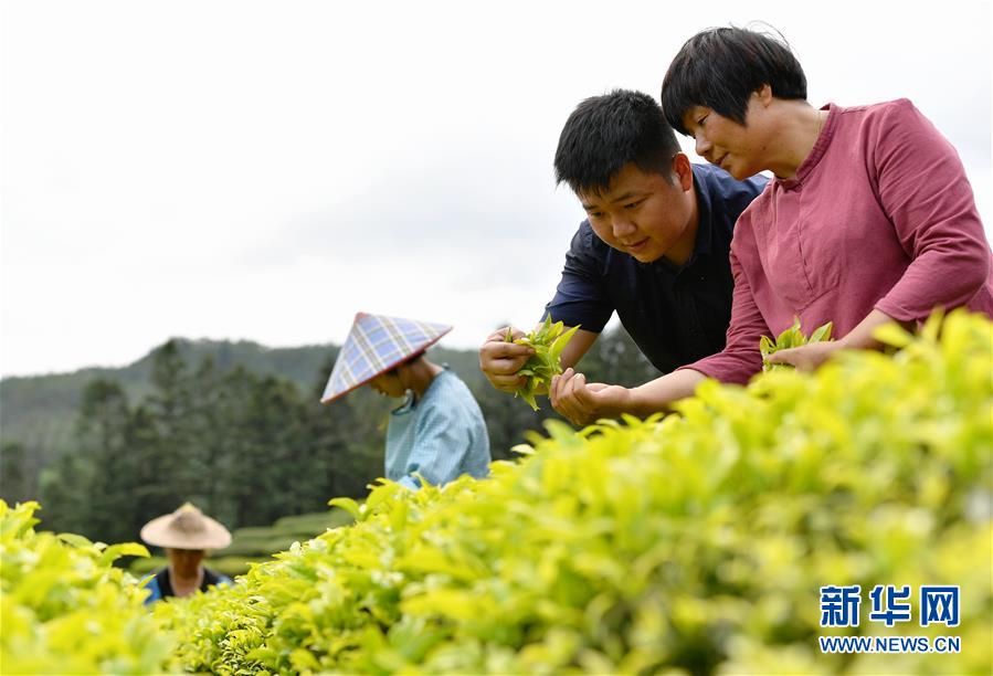 方舟跟着母亲游玉琼(右)学习采摘武夷岩茶中的白鸡冠品种(5月10日摄)。新华社记者魏培全摄
