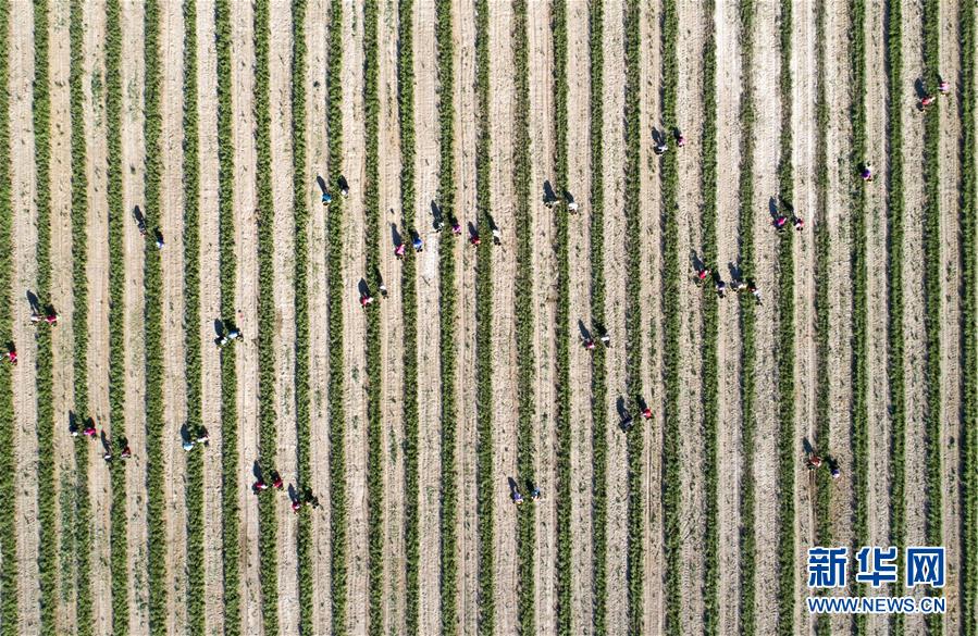 5月11日,采茶工在宁夏百瑞源贺兰山基地采摘枸杞芽茶(无人机照片)。当日,宁夏百瑞源贺兰山基地枸杞芽茶全面进入采摘季。据了解,该基地茶园面积300余亩,助力附近200多名农民就业增收。新华社记者杨植森摄