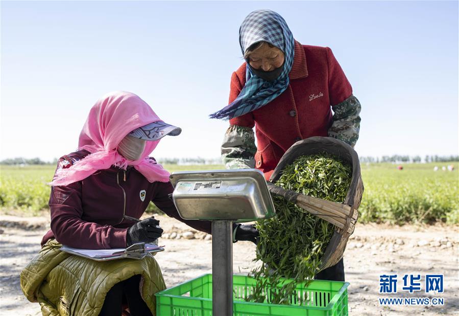 5月11日,在宁夏百瑞源贺兰山基地,工作人员对采摘的枸杞芽茶进行称重。当日,宁夏百瑞源贺兰山基地枸杞芽茶全面进入采摘季。据了解,该基地茶园面积300余亩,助力附近200多名农民就业增收。新华社记者杨植森摄