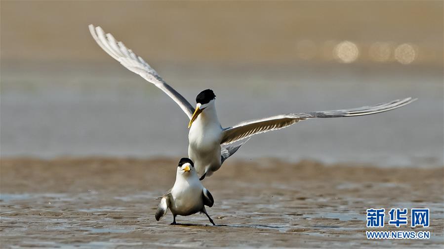 眼下正是大凤头燕鸥繁育的时节,在福建闽江河口湿地核心区鳝鱼滩的沙洲上,大凤头燕鸥正相互嬉戏(5月9日摄)。新华社记者梅永存摄