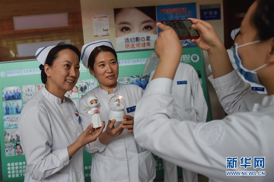 5月11日,在北京地坛医院感染二科护士站,护士们被在护士节收到的礼物——天使玩偶所吸引。北京地坛医院是北京市收治新冠肺炎患者的定点医院之一,医院的医护人员一直奋战在抗击疫情的一线。在国际护士节前夕,记者前往北京地坛医院,记录下抗疫一线护士的日常工作状态。新华社记者彭子洋摄