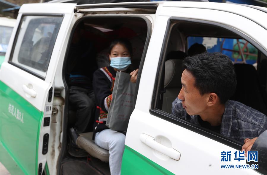 5月12日,在四川省昭觉县阿土列尔村,莫色雄体(右)坐上车准备前往昭觉县易地扶贫搬迁县城集中安置点的新家。新华社记者江宏景摄