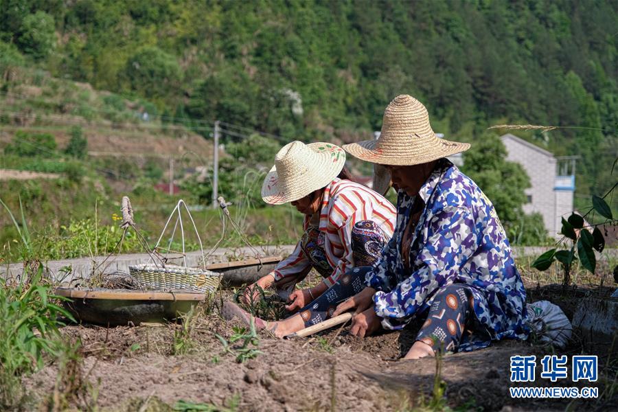 5月12日,青田县巨浦乡西坑村的村民在梯田收获中药贝母。新华社记者徐昱摄