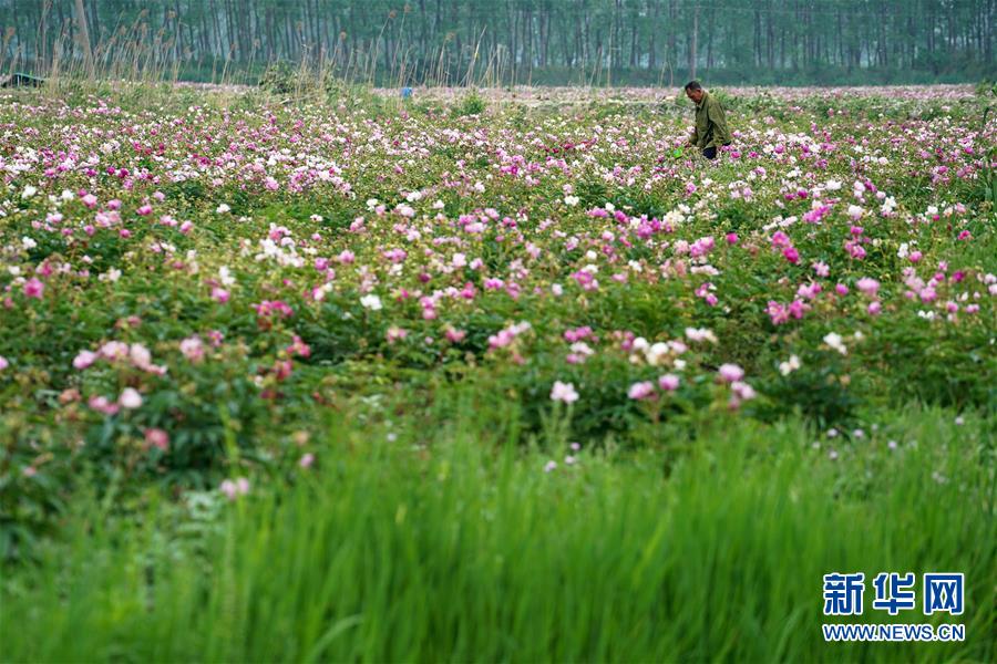 工作人员在金湖县金灿芍药园里进行农业管理(5月11日摄)。新华社记者韩瑜庆摄