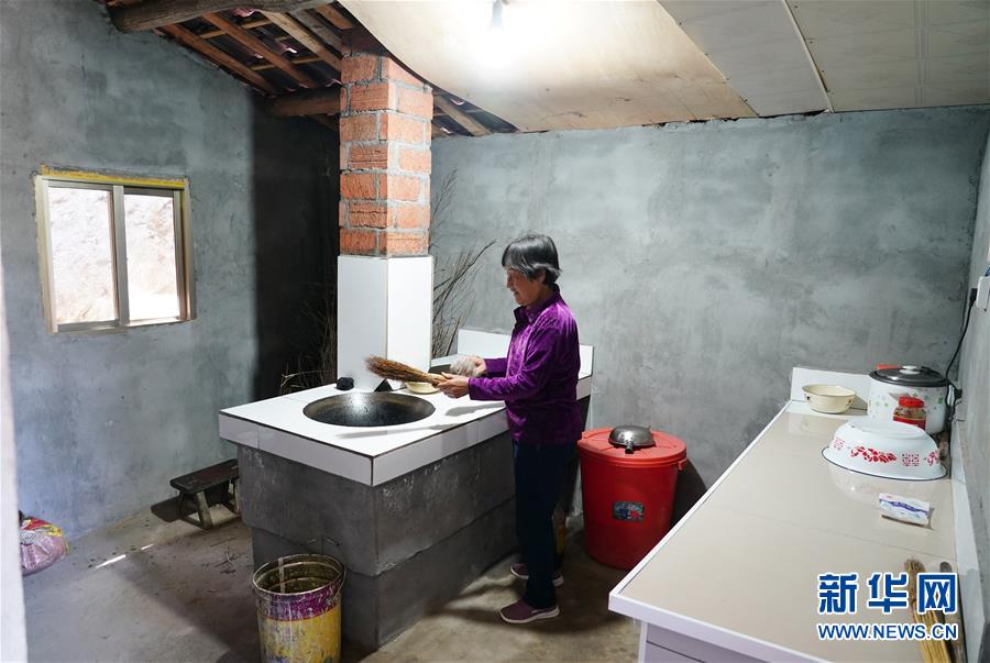 5月12日,在安康市汉滨区早阳镇寨垭村,村民尚玉莲在自家改造后的厨房内清洁灶台。新华社记者邵瑞摄