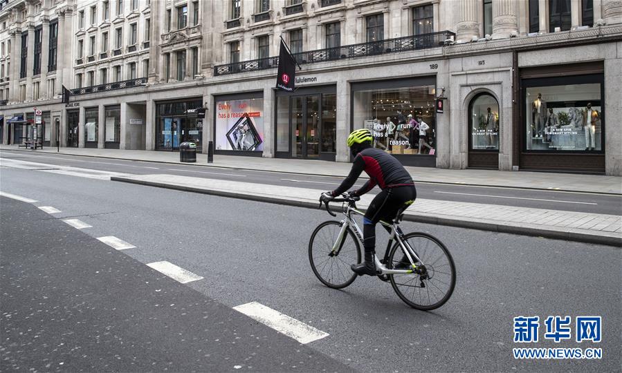5月12日,在英国伦敦,一名男子骑行经过摄政街关闭的店铺。新华社记者韩岩摄