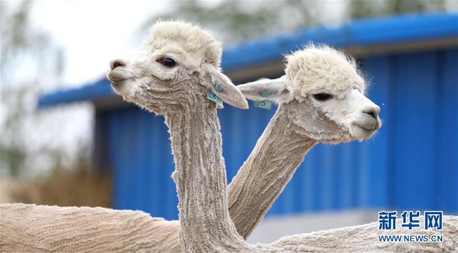 5月12日,两只剪下绒毛的羊驼在养殖基地的饲养舍里。新华社记者姚剑锋摄