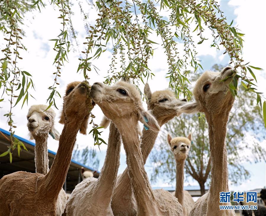 5月12日,几只剪下绒毛的羔羊驼在养殖基地的饲养舍里。新华社记者姚剑锋摄