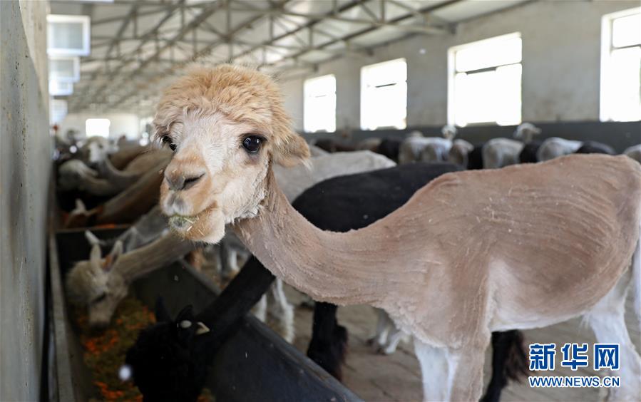 5月12日,剪下绒毛的羊驼在养殖基地的饲养舍里。新华社记者姚剑锋摄