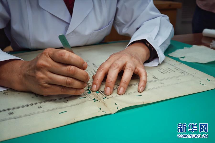 5月13日,天一阁藏品修复部主任王金玉在对书页进行修复。天一阁藏品修复部目前有修复师14人,每年约修复古籍14000余页。据介绍,修复一册古籍通常需要1至2个月,有的甚至需要1年以上。新华社记者郑梦雨摄