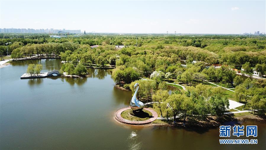 这是5月13日拍摄的太阳岛风景区(无人机照片)。时下,位于黑龙江省哈尔滨市的太阳岛国家级风景名胜区草青树绿,绿意盎然。新华社记者王建威摄