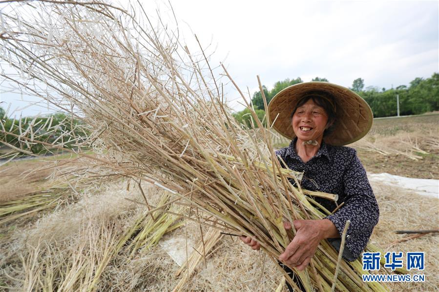 5月13日,在贵州省黔西县洪水镇解放村,村民在采收油菜籽。