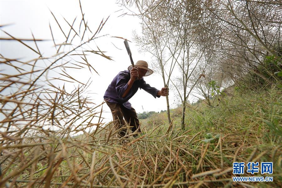 5月13日,在贵州省黔西县洪水镇解放村,村民在采收油菜籽。新华社记者杨楹摄