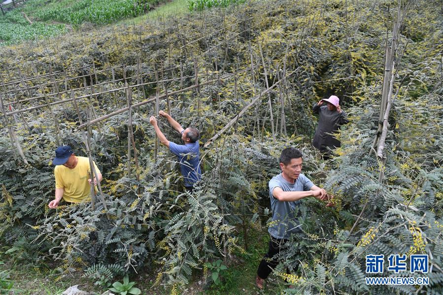 5月13日,在广西环江毛南族自治县下南乡下塘村,村民在管护中草药。新华社记者陆波岸摄