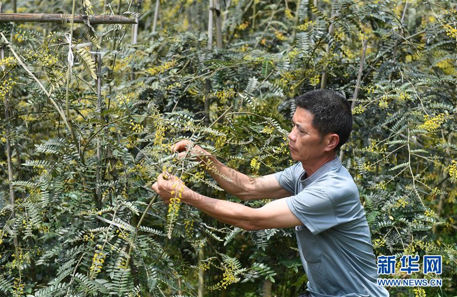 5月13日,在广西环江毛南族自治县下南乡下塘村,村民在管护中草药。新华社记者陆波岸摄