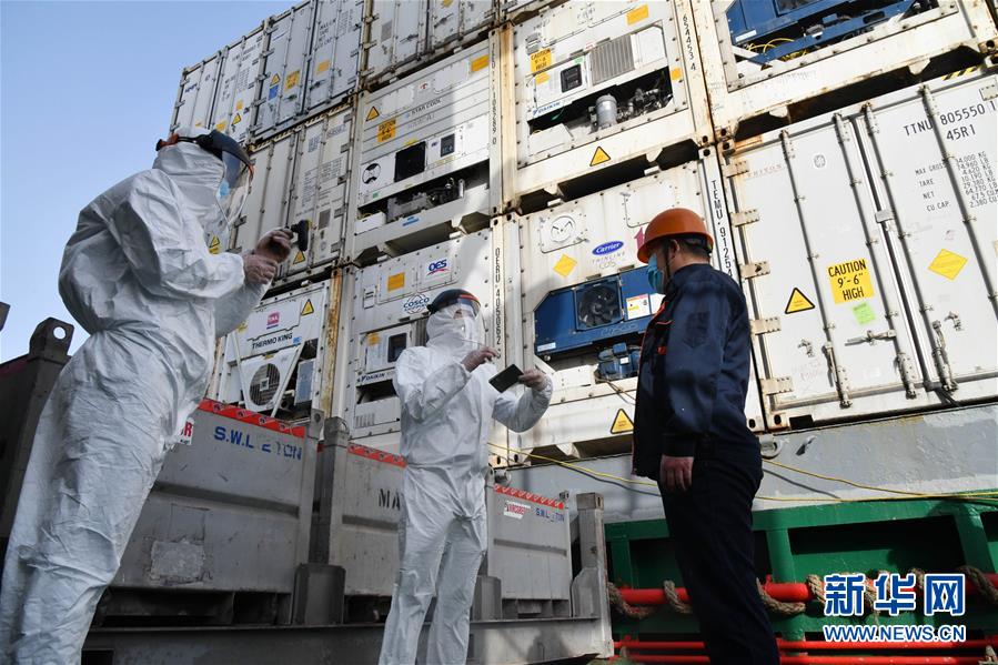 5月13日,山东威海出入境边防检查站民警在核对外籍船员证件。面对疫情防控要求,山东威海出入境边防检查站严密勤务组织、强化数据研判,加强口岸、码头的日常巡查,对国际船舶和船员强化监管,全力打好疫情防输入攻坚战。据统计,自2月份以来,威海边检站共服务出入境(港)船舶400余艘次,出入境(港)人员7000多人次,为180多个集装箱防疫物资提供通关便利。新华社记者朱峥摄