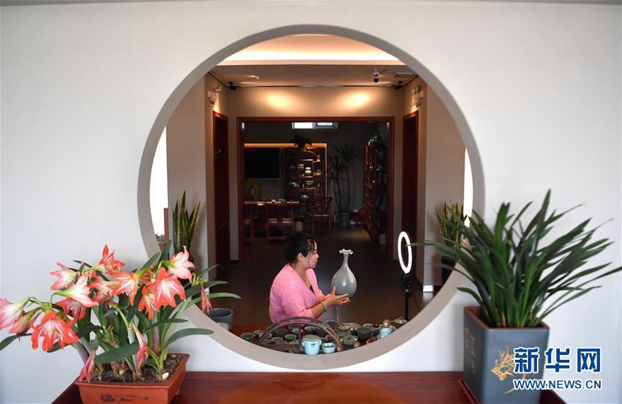 5月13日,宝丰县大营镇的汝瓷艺人李莹娟在宣和汝瓷展厅直播介绍汝瓷产品。新华社记者李嘉南摄