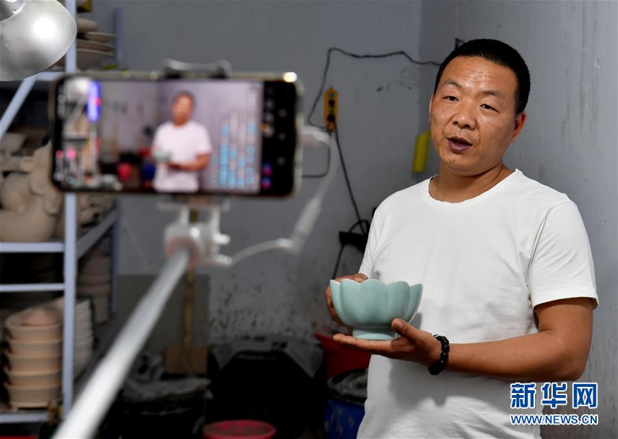 5月13日,宝丰县大营镇的汝瓷艺人王国奇在拍摄汝瓷产品短视频。新华社记者李嘉南摄
