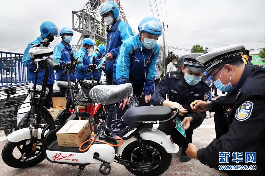 5月14日,青岛市李沧交警部门民警为一外卖企业员工集中办理电动自行车挂牌。新华社记者李紫恒摄