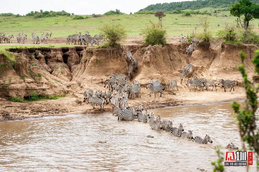 当时有超过1000只斑马,正在河岸上等候合适的机会过河,它们快速低头喝水后又迅速返回河岸。